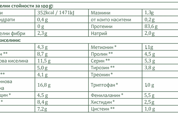 Подходящ за деца и възрастни, и за подсилване на организма. Идеален за приготвяне на печива, гофрети, бисквитки, както и да се добавя в супи и сосове. Разтваря се във вода.  Може да послужи като натурален емулгатор и заместител на месо. Комбинира се добре с ядки, зеленчуци, бобови храни и др. Произход: ЕС. Продукт с гарантирано качество. Да се съхранява на сухо и хладно място, при стайна температура.