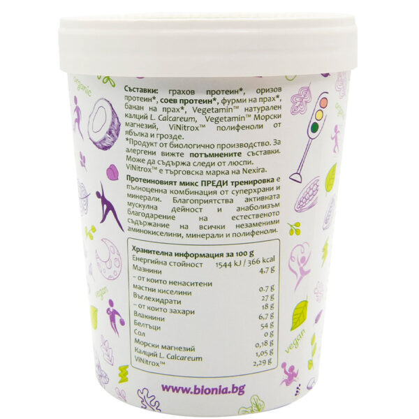 Нето тегло: ℮ 200 g БЕЗ ГМО ВЕГАН Произведено от ПРИРОДАТА.® Протеиновият микс ПРЕДИ тренировка е пълноценна комбинация от суперхрани и минерали. Благоприятства активната мускулна дейност и анаболизъм благодарение на естественото съдържание на всички незаменими аминокиселини, минерали и полифеноли.