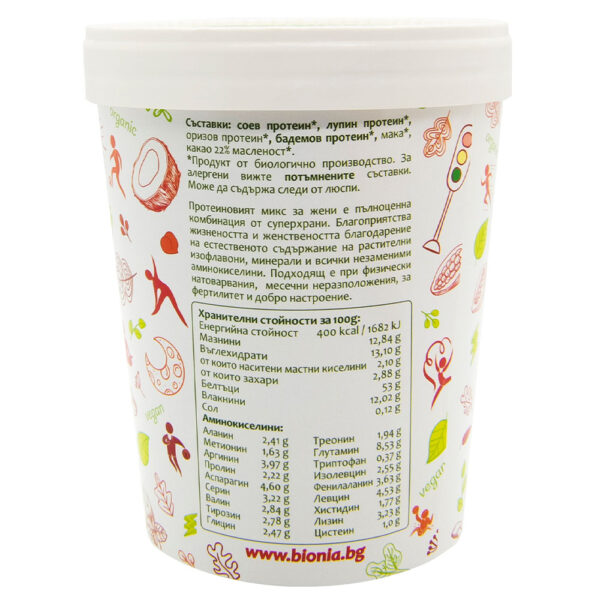 Нето тегло: ℮ 1 kg (5x200 g) БЕЗ ГМО ВЕГАН Протеиновият микс за жени е пълноценна комбинация от суперхрани. Благоприятства жизнеността и женствеността благодарение на естественото съдържание на растителни изофлавони, минерали и всички незаменими аминокиселини. Подходящ е при физически натоварвания,  месечни неразположения, за фертилитет и добро настроение.
